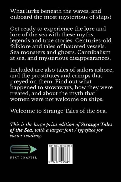 What lurks beneath the waves, and onboard the most mysterious of ships? Get ready to experience the lore and lure of the sea with these myths, legends and true stories. Centuries-old folklore and tales of haunted vessels. Sea monsters and ghosts. Cannibalism at sea, and mysterious disappearances. Included are also tales of sailors ashore, and the prostitutes and crimps that preyed on them. Find out what happened to stowaways, how they were treated, and about the myth that women were not welcome on ships. Welcome to Strange Tales of the Sea. ¿This is the large print edition of Strange Tales Of The Sea, with a larger font / typeface for easier reading.¿