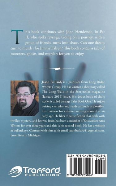 This book continues with John Henderson, in Pet II, who seeks revenge. Going on a journey, with a group of friends, turns into chaos. Can one dream turn to murder for Jimmy Falcon? This book contains tales of monsters, ghosts, and murders for you to enjoy.