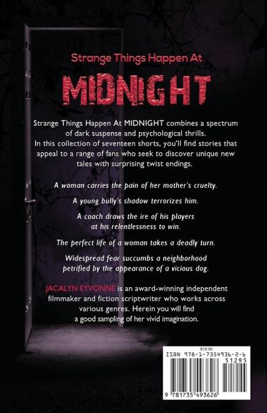 Strange Things Happen At MIDNIGHT combines a spectrum of dark suspense and psychological thrills. In this collection of seventeen shorts, you'll find stories that appeal to a range of fans who seek to discover unique new tales with surprising twist endings. A woman carries the pain of her mother's cruelty. A young bully's shadow terrorizes him. A coach draws the ire of his players at his relentlessness to win. The perfect life of a woman takes a deadly turn. Widespread fear succumbs a neighborhood petrified by the appearance of a vicious dog.