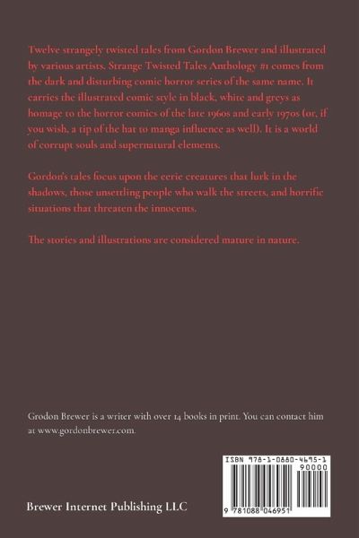 Twelve strangely twisted tales from Gordon Brewer and illustrated by various artists. Strange Twisted Tales Anthology #1 comes from the dark and disturbing comic horror series of the same name. It carries the illustrated comic style in black, white and greys as homage to the horror comics of the late 1960s and early 1970s (or, if you wish, a tip of the hat to manga influence as well). It is a world of corrupt souls and supernatural elements. Gordon's tales focus upon the eerie creatures that lurk in the shadows, those unsettling people who walk the streets, and horrific situations that threaten the innocents. The stories and illustrations are considered mature in nature.