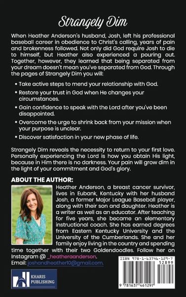 When Heather Anderson's husband, Josh, left his professional baseball career in obedience to Christ's calling, years of pain and brokenness followed. Not only did God require Josh to die to himself, but Heather also experienced a pouring out. Together, however, they learned that being separated from your dream doesn't mean you've separated from God. Through the pages of Strangely Dim you will: ¿ Take active steps to mend your relationship with God. ¿ Restore your trust in God when He changes your circumstances. ¿ Gain confidence to speak with the Lord after you've been disappointed. ¿ Overcome the urge to shrink back from your mission when your purpose is unclear. ¿ Discover satisfaction in your new phase of life.Strangely Dim reveals the necessity to return to your first love. Personally experiencing the Lord is how you obtain His light, because in Him there is no darkness. Your pain will grow dim in the light of your commitment and God's glory. Endorsement:Because the light of God's goodness is sometimes overshadowed by the dim realities of broken dreams and private anguish, Heather Anderson has written a deeply personal guide with the singular goal of helping us find our way again. She writes, not as a spectator from the stands, but as an active participant on the field of adversity. Her biblical insights will instruct you even as the story of her family inspires you. Read this book to be better prepared for the darkest days of your life.-Adam B. Dooley, senior pastor, Englewood Baptist Church, Jackson, Tennessee, and author of Hope When Life Unravels Not only did I enjoy the love story between Heather and Josh Anderson, but I also was drawn to the life lessons she has drawn from their lives. I appreciated Heather's transparency as well as the reminder that being separated from our dreams does not mean we are separated from God.-Mike Yorkey, co-author of Out of the Wilderness and At First Light About the Author:Heather Anderson, a breast cancer survivor, lives in Eubank, Kentucky with her husband Josh, a former Major League Baseball player, along with their son and daughter. Heather is a writer as well as an educator. After teaching for five years, she became an elementary instructional coach. She has earned degrees from Eastern Kentucky University and the University of the Cumberlands. She and her family enjoy living in the country and spending time together with their two Goldendoodles.