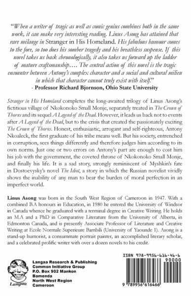 Stranger in His Homeland completes the long-awaited trilogy of Linus Asong's fictitious village of Nkokonoko Small Monje, separately treated in The Crown of Thorns and its sequel A Legend of the Dead. However, it leads us back not to events after A Legend of the Dead, but to the crisis that created the passionately exciting The Crown of Thorns. Honest, enthusiastic, arrogant and self-righteous, Antony Nkoaleck, the first graduate of his tribe means well. But his society, entrenched in corruption, sees things differently and therefore judges him according to its own norms. Just one or two errors on Antony's part are enough to cost him his job with the government, the coveted throne of Nkokonoko Small Monje, and finally his life. It is a sad story, strongly reminiscent of Myshkin's fate in Dostoevysky's novel The Idiot, a story in which the Russian novelist vividly shows the inability of any man to bear the burden of moral perfection in an imperfect world.