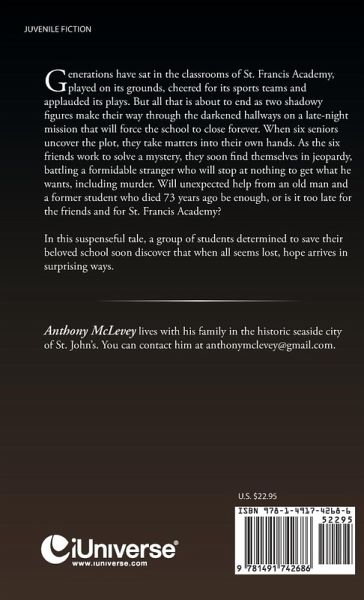 Generations have sat in the classrooms of St. Francis Academy, played on its grounds, cheered for its sports teams and applauded its plays. But all that is about to end as two shadowy figures make their way through the darkened hallways on a late-night mission that will force the school to close forever. When six seniors uncover the plot, they take matters into their own hands. As the six friends work to solve a mystery, they soon find themselves in jeopardy, battling a formidable stranger who will stop at nothing to get what he wants, including murder. Will unexpected help from an old man and a former student who died 73 years ago be enough, or is it too late for the friends and for St. Francis Academy? In this suspenseful tale, a group of students determined to save their beloved school soon discover that when all seems lost, hope arrives in surprising ways.