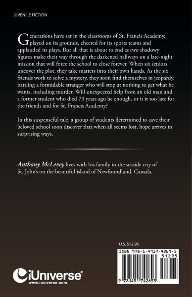 Generations have sat in the classrooms of St. Francis Academy, played on its grounds, cheered for its sports teams and applauded its plays. But all that is about to end as two shadowy figures make their way through the darkened hallways on a late-night mission that will force the school to close forever. When six seniors uncover the plot, they take matters into their own hands. As the six friends work to solve a mystery, they soon find themselves in jeopardy, battling a formidable stranger who will stop at nothing to get what he wants, including murder. Will unexpected help from an old man and a former student who died 73 years ago be enough, or is it too late for the friends and for St. Francis Academy? In this suspenseful tale, a group of students determined to save their beloved school soon discover that when all seems lost, hope arrives in surprising ways.