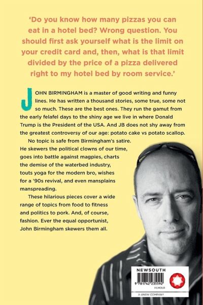 John Birmingham is a master of good writing and funny lines. He has written a thousand stories, some true, some not so much. These are the best ones and they're so good, and so funny, there has been no barrel-scraping involved. Really, this book could have been much longer. The pieces contained within these pages run the gamut from the early felafel days to the shiny age we live in where Donald Trump is the President of the USA. And it does not shy away from the greatest controversy of our age: potato cake vs potato scallop. These hilarious pieces cover a wide range of topics from food to fitness and politics to pork, in all its glories. And, of course, fashion. Ever the equal opportunist, John Birmingham skewers them all.