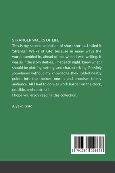 STRANGER WALKS OF LIFE This is my second collection of short stories. I titled it 'Stranger Walks of Life' because in many ways the words tumbled in, ahead of me, when I was writing. It was as if the story deities, I met each night, knew what I should be plotting, setting, and characterizing. Possibly sometimes without my knowledge they folded neatly points into the themes, morals and promises to my audience. All I had to do was work harder on the clock, crucible, and contract! I hope you enjoy reading this collection. Aiyeko-ooto