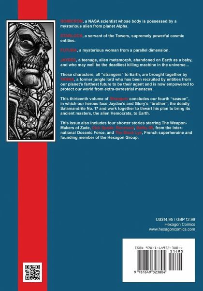 HOMICRON is a NASA scientist whose body is inhabited by a mysterious alien from planet Alpha. STARCYB is a servant of the Towers, supremely powerful cosmic entities. FUTURA is a mysterious woman from a parallel dimension. JALEB is the secretive agent of a Galactic Federation of telepaths. JAYDEE is a teenage, alien metamorph, abandoned on Earth as a baby, and who may well be the deadliest killing machine in the universe... These characters, all "strangers" to Earth, are brought together by TANKA, a former jungle lord who has been recruited by entities from our planet's farthest future to be their "time agent" and is now empowered to protect our world from extra-terrestrial menaces. This thirteenth volume of Strangers concludes our fourth "season", in which our heroes face Jaydee's and Glory's "brother", the deadly Salamandrite No. 17 and work together to thwart his plan to bring its ancient masters, the alien Hemocrats, to Earth. This issue also includes four shorter stories starring The Weapon-Makers of Zade, Dick Spade: Revenant, Bathy-09: from the International Oceanic Force. and The Black Lys, French superheroine and founding member of the Hexagon Group.