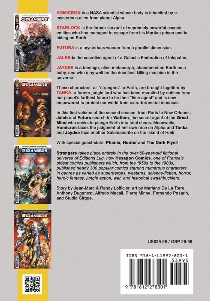 HOMICRON is a NASA scientist whose body is inhabited by a mysterious alien from planet Alpha. STARLOCK is the former servant of supremely powerful cosmic entities who has managed to escape from his Martian prison and is hiding on Earth. FUTURA is a mysterious woman from a parallel dimension.JALEB is the secretive agent of a Galactic Federation of telepaths. JAYDEE is a teenage, alien metamorph, abandoned on Earth as a baby, and who may well be the deadliest killing machine in the universe...These characters, all "strangers" to Earth, are brought together by TANKA, a former jungle lord who has been recruited by entities from our planet’s farthest future to be their "time agent" and is now empowered to protect our world from extra-terrestrial menaces. In this second volume, from Paris to New Orleans, Jaleb and Futura search for Wathan, the secret agent of the Great Mind who seeks to plunge Earth into total chaos. Meanwhile, Homicron faces the judgment of her own race on Alpha and Tanka and Jaydee face another Salamandrite on the island of Haiti. With special guest-stars: Phoenix, Hunter and The Dark Flyer! Strangers takes place entirely in the over 70-year-old fictional universe of Hexagon Comics, one of France’s oldest comics publishers which, from the 1950s to the 1980s, published nearly 300 popular comics starring numerous characters in genres as varied as superheroes, westerns, science-fiction, horror, heroic fantasy, jungle action, war, and historical swashbucklers.