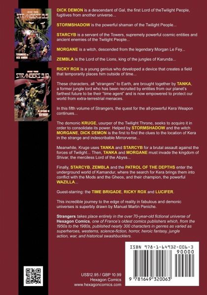 DICK DEMON is a descendant of Gal, the first Lord of theTwilight People, fugitives from another universe... STORMSHADOW is the powerful shaman of the Twilight People... STARCYB is a servant of the Towers, supremely powerful cosmic entities and ancient enemies of the Twilight People... MORGANE is a witch, descended from the legendary Morgan Le Fey... ZEMBLA is the Lord of the Lions, king of the jungles of Karunda...RICKY ROX is a young genius who developed a device that creates a field that temporarily places him outside of time... These characters, all "strangers" to Earth, are brought together by TANKA, a former jungle lord who has been recruited by entities from our planet's farthest future to be their "time agent" and is now empowered to protect our world from extra-terrestrial menaces. In this fifth volume of Strangers, the quest for the all-powerful Kera Weapon continues... The demonic KRUGE, usurper of the Twilight Throne, seeks to acquire it in order to consolidate its power. Helped by STORMSHADOW and the witch MORGANE, DICK DEMON is the first to find the clues to the location of Kera in the strange and indescribable Mirrorverse... Meanwhile, Kruge uses TANKA and STARCYB for a brutal assault against the forces of Twilight... Then, TANKA and MORGANE must invade the kingdom of Shivar, the merciless Lord of the Abyss... Finally, STARCYB, ZEMBLA and the PATROL OF THE DEPTHS enter the underground world of Kamandur, where the search for Kera brings them into conflict with the Mods and the Gheos, and their champion, the powerful WAZILLA... Guest-starring: the TIME BRIGADE, RICKY ROX and LUCIFER. This incredible journey to the edge of reality in fabulous and demonic universes is superbly drawn by Manuel Martin Peniche.
