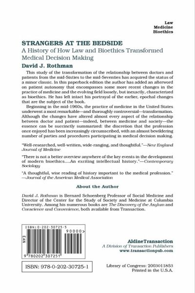 David Rothman gives us a brilliant, finely etched study of medical practice today. Beginning in the mid-1960s, the practice of medicine in the United States underwent a most remarkable--and thoroughly controversial--transformation. The discretion that the profession once enjoyed has been increasingly circumscribed, and now an almost bewildering number of parties and procedures participate in medical decision making. Well into the post-World War II period, decisions at the bedside were the almost exclusive concern of the individual physician, even when they raised fundamental ethical and social issues. It was mainly doctors who wrote and read about the morality of withholding a course of antibiotics and letting pneumonia serve as the old man's best friend, of considering a newborn with grave birth defects a "stillbirth" thus sparing the parents the agony of choice and the burden of care, of experimenting on the institutionalized the retarded to learn more about hepatitis, or of giving one patient and not another access to the iron lung when the machine was in short supply. Moreover, it was usually the individual physician who decided these matters without formal discussions with patients, their families, or even with colleagues, and certainly without drawing the attention of journalists, judges, or professional philosophers. The impact of the invasion of outsiders into medical decision-making, most generally framed, was to make the invisible visible. Outsiders to medicine--that is, lawyers, judges, legislators, and academics--have penetrated its every nook and cranny, in the process giving medicine exceptional prominence on the public agenda and making it the subject of popular discourse. The glare of the spotlight transformed medical decision making, shaping not merely the external conditions under which medicine would be practiced (something that the state, through the regulation of licensure, had always done), but the very substance of medical practice--the decisions that physicians made at the bedside.
