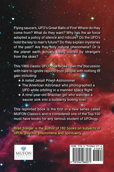 This reprinted book is the first in a new series called MUFON Classics and is considered one of the Top 100 must have books for any serious student of UFOlogy. Flying saucers, UFO's Great Balls of Fire! Where do they come from? What do they want? Why has the air force adopted a policy of silence and ridicule? Do the UFO's hold the key to man's future? Do they explain mysteries of the past? Are they only natural phenomena? Or is the planet earth actually being visited by strangers from the skies? This 1966 classic UFO book broke open the discussion with hard to ignore reports from people with nothing to gain including: A noted Jesuit Priest-Astronomer The American Astronaut who photographed a UFO while orbiting in a manned space flight A nine-year-old Brazilian girl who watched a saucer sink into a suddenly boiling river. Brad Steiger is the author of 182 books on subjects of UFOs, psychic phenomena and spirituality.