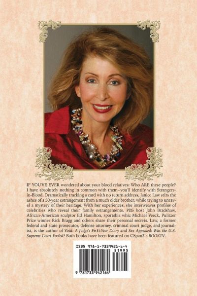IF YOU'VE EVER wondered about your blood relatives: Who ARE these people? I have absolutely nothing in common with them--you'll identify with Strangersin-Blood. Dramatically tracking a card with no return address, Janice Law stirs the ashes of a SO-year estrangement from a much older brother; while trying to unravel a mystery of their heritage. With her experiences, she interweaves profiles of celebrities who reveal their family estrangements. PBS host John Bradshaw, African-American sculptor Ed Hamilton, sportsbiz whiz Michael Veeck, Pulitzer Prize winner Rick Bragg and others share their personal secrets. Law, a former federal and state prosecutor, defense attorney, criminal court judge, and journalist, is the author of Yield: A Judge's Fir$t-Year Diary and Sex Appealed: Was the U.S. Supreme Court Fooled? Both books have been featured on CSpan2's BOOKTV.