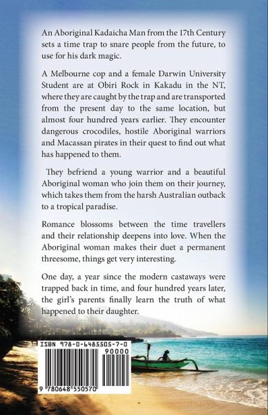 A man and a woman, strangers to each other and tourists at Kakadu, in the Top End of the Northern Territory are caught in a time trap, set by an evil Aboriginal Kadaicha Man from the 17th Century, who plans to use the lives of people from the future to enhance his powers. Suddenly finding themselves trapped inexplicably in the same location but hundreds of years in the past, William and Cathy find themselves alone in the harsh tropical bush, everyone and everything that they know suddenly gone. They decide to try and get back to where Darwin should be, hoping for answers to what has happened to them and how far back in time they have come. As they journey, they become lovers, finding comfort in each other's arms. With swollen rivers full of huge crocodiles to cross and having to find food and shelter, they make bows and arrows, learning to gather from nature and hunt for their food as they go. They encounter hostile Aboriginals and save one young warrior's life as he flees an enemy tribe. Back with his tribe, the young warrior tells of his saviours but only a beautiful young part islander, part Aboriginal woman believes his story. She seeks William and Cathy out and is fascinated by the strange white people. She decides to leave her tribe and to join them on their journey. In the weeks that follow, she finds her way into their hearts and makes their partnership a three-way marriage. The young warrior brings his new wife and joins them on their trek as well. They narrowly escape the enemy tribe and, fleeing from them, come across the remains of another person who was trapped back in time from the 20th Century. Among the belongings of the old Crocodile hunter is a Lee-Enfield rifle which lacks only ammunition. After months of travel they arrive where Darwin should be only to find unspoilt beaches and virgin bush. They witness Macassan pirates attacking a crew of trepang hunters and manage to save two of the islanders. Another attack by hostile aboriginals, led by the Kadaicha man results in the death of the young warrior's wife. They realise that to stay in Australia is to risk changing the future and so sail back to the island home of the trepang hunters. Pursued by both Macassan pirates and the Kadaicha Man, they leave Australia and arrive only to find that the island has been attacked by the Macassan pirates, with whole villages wiped out. Gathering up survivors, they locate another, uninhabited island and begin to establish a new home. They build a fort, take in other survivors of the pirates and arm themselves with ideas from the 21st Century. The pirates discover their location and launch a huge raid. In the battle that follows, the pirates are wiped out by the cannon, rifle and cross-bows used by the defenders. With peace at last they begin to prosper, trading with a Chinese merchant and the Dutch East India Company. William's wives both have children and as the years roll on, they in turn find husbands and wives and have their own families, all of whom have their own offspring until the years between the 17th and 21st Centuries are spanned. Back in the present day, a young brother and sister arrive at Cathy's parents' home in Darwin and they finally reveal the story of the Strangers in the Dreamtime.