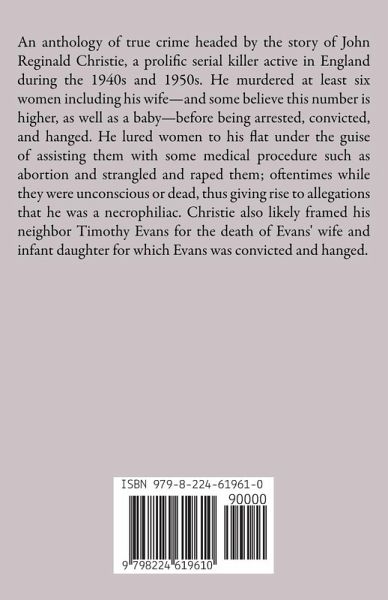 An anthology of true crime headed by the story of John Reginald Christie, a prolific serial killer active in England during the 1940s and 1950s. He murdered at least six women including his wife-and some believe this number is higher, as well as a baby-before being arrested, convicted, and hanged. He lured women to his flat under the guise of assisting them with some medical procedure such as abortion and strangled and raped them; oftentimes while they were unconscious or dead, thus giving rise to allegations that he was a necrophiliac. Christie also likely framed his neighbor Timothy Evans for the death of Evans' wife and infant daughter for which Evans was convicted and hanged.