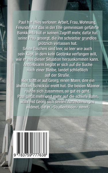 Paul hat alles verloren: Arbeit, Frau, Wohnung, Freunde. Auf das in der Ehe gemeinsam geführte Bankkonto hat er keinen Zugriff mehr, dafür hat seine Frau, die ihn scheinbar grundlos plötzlich verlassen hat, gesorgt. Seine Taschen sind leer, so leer wie auch sein Kopf, in dem kein Gedanke verfangen will, wie er aus dieser Situation herauskommen kann. Antriebsarm begibt er sich auf die Suche nach einer Bleibe, landet schließlich auf der Straße. Hier trifft er auf Georg, einen Mann, den ein ähnliches Schicksal ereilt hat. Die beiden Männer raufen sich zusammen, so gut es geht. Paul gerät mehr und mehr auf die schiefe Bahn, während Georg sich seinen Aufzeichnungen widmet, die er »Straßenbilder« nennt. Aus dem Zweckbündnis dieses ungleichen Paares erwachsen mit der Zeit kleine wechselseitige Abhängigkeiten, die ihr Leben auf der Straße ein klein wenig erträglicher erscheinen lassen. Das Zusammenleben der beiden Männer findet abrupt ein tragisches Ende.