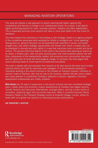 The book explains the importance of articulating a clear strategy, based on a rigorous analysis of the competitive landscape while avoiding the pitfalls of ambiguity and 'virtue signalling'. Having done so, demand forecasts can be developed that resemble S-curves, not simple straight lines, that reflect strategic opportunities and threats from which a master plan can be developed to allocate land and capital in a way that maximizes return on assets and social licence. The second distinctive feature of this book is the premise that planning an airport as an island, a fortress even, does not work anymore given how interconnected airports are with other components of the transportation system, the economies and communities they serve and the rapid pace of social and technological change. In summary, the book argues that airport planning needs to move beyond its traditional boundaries.