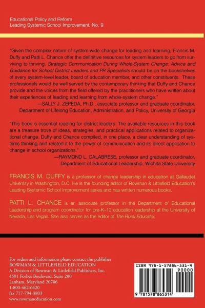 Given the complex nature of system-wide change for leading and learning, Francis M. Duffy and Patti L. Chance offer the definitive resources for system leaders to go from surviving to thriving. Strategic Communication During Whole-System Change: Advice and Guidance for School District Leaders and PR Specialists should be on the bookshelves of every system-level leader, board of education member, and other constituents. These professionals would be well served by the contemporary thinking that Duffy and Chance provide and the voices from the field offered by the practitioners who have written about their experiences of leading and learning from whole system change. -- Sally J. Zepeda, Ph.D., associate professor and graduate coordinator, Department of Lifelong Education, Administration, and Policy, University of Georgi Solid information is presented...The book provides a great amount of information. School Administrator, February 2009 This book is essential reading for district leaders. The available resources in this book are a treasure trove of ideas, strategies, and practical applications related to organizational change. Duffy and Chance compiled, in one place, a clear understanding of systems thinking and related it to the power of communication and its direct application to change in school organizations. -- Dr. Raymond L. Calabrese, professor and graduate coordinator, Department of Educational Leadership, Wichita State University