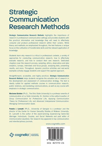 Strategic Communication Research Methods provides students with the knowledge and tools they will need to use and conduct research effectively in their careers. While theory and methods are emphasized throughout, the focus on cultivating transferable skills and the relevant application of knowledge reinforce the book's practicality. Students learn why research is critical in professional contexts, the various approaches for conducting communication research, how to evaluate research effectively, and how to conduct their own research. Chapters cover the research process, sampling, ethics, observation, data analytics, surveys, interviews and focus groups, experiments, and how to analyze and present research results. Throughout, dynamic practice activities and real-world examples actively engage students and support the applied approach. The second edition builds on the strengths of the previous edition by including a new chapter on digital data analytics and big data, as well as expanded information on analyzing qualitative and quantitative data. Throughout the book, contemporary research and examples provide students with the most current information in a way that resonates. Straightforward, accessible, and highly practical, this text helps students recognize the valuable role of research in the development and assessment of communication strategies.