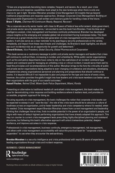"Crises are progressively becoming more complex, frequent, and severe. As a result, your crisis preparedness and response capabilities must adapt to the new landscape when there is only one chance to "get it right." Brendan Monahan provides Crisis Management 2.0 insights that go beyond traditional preparedness and response approaches. Strategic Corporate Crisis Management: Building the Unconquerable Organization is a well written and visionary guide for handing crises of the future." Bruce T. Blythe, Chairman R3 Continuum (Ready, Respond, Recover)