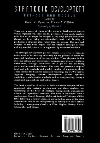 There are a range of views of the strategic development process within organisations. Some see the process as being purely creative, with little or no scope for analysis at any stage (hunch-and-hope). Others see it as being over-formalised, static and focusing on producing a strategic plan rather than on actions. The approach adopted in this book argues that for effective strategic decision making, creativity needs to be supported by structured methods. The strategic development process consists of a series of elements which need to be working effectively for the process to ensure the successful development of the organisation. These elements include objective setting and performance measurement, strategic initiative formulation, strategic evaluation and a process for modelling uncertain/uncontrollable factors. The book then presents a range of hard and soft methods and models capable of supporting them. These include the balanced scorecard, visioning, the TOWS matrix, cognitive mapping, scenario development, systems dynamics modelling, transformation methods such as reengineering, strategic investment appraisal and real option theory. The book should be of interest to both academics and practitioners concerned with strategic development and those teaching and researching in the fields of strategic management, management science and operational research. The book is developed from aprevious text Strategic Planning: Models and Analytical Techniques, (Wiley, 1992) following a similar approach and including some of the same methods and models but incorporating an entirely new set of articles including contemporary classics by Eden, Kaplan, Keeney, Porter, Schoemaker and others.