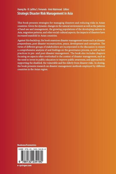 Chapter 1. Strategic Disaster Management in Asia: An Introduction.- Chapter 2. Diaster Management in the Five Year Plans of Bangladesh: An Assessment.- Chapter 3. Politico-Administrative Response to the Diastrous Impact of Hydro Power on Nature and People: A Case Study.- Chapter 4. Disability in Humanitarian Emergencies in India: Towards an Inclusive Approach.- Chapter 5. Disaster Management and Role of Armed Forces: Critical Analysis of Reactive Disaster Management in India.- Chapter 6. An Analysis of the Effectiveness of Implementing Public Awareness, Education and Training Programs as a Risk Reduction Strategy in Disaster Management in Sri Lanka.- Chapter 7. Effectiveness of Administrative Preparedness: A Case Study on Flooding Conditions in Ambangamuwa Korale Division of Nuwara Eliya District in Sri Lanka.- Chapter 8. Mitigating Disasters through Community Involvement and Righteous Practices in Himalayan Region of Uttarakhand, India.- Chapter 9. Administrative Planning and Political Response to a Post-Disaster Reconstruction: A Study of Aila (Cyclone) Devastated Gosaba Block in West Bengal (India).- Chapter 10. Missing Link between State and Community: Post Tsunami Reconstruction and Rehabilitation of Alappad Panchayat, Kerala, India.- Chapter 11. Ridge to Reef Approach to Development.- Chapter 12. Humanitarian Logistics in Asia: A Missing Link in Disaster Management and Practice.- Chapter 13. Disaster Management and Corruption: Issues, Interventions and the way ahead.- Chapter 14. Disaster Management in Border Sensitive Area: Case Study of Amritsar District.- Chapter 15. Disaster Management in Asia: Lessons Learned and Policy Implications.