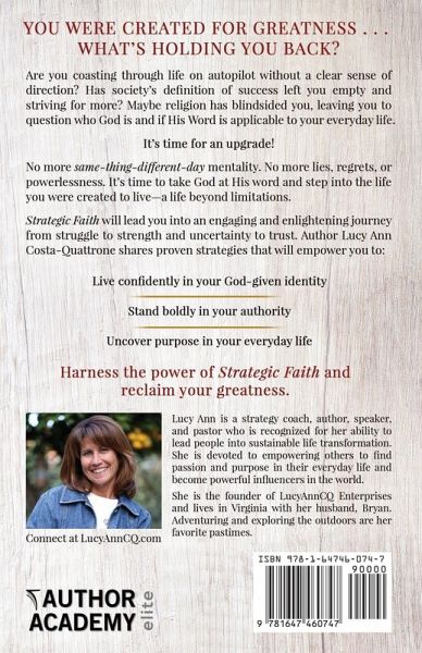 YOUR WERE CREATED FOR GREATNESS . . . WHAT'S HOLDING YOU BACK? Are you coasting through life on autopilot without a clear sense of direction? Has society's definition of success left you empty and striving for more? Maybe religion has blindsided you, leaving you to question who God is and if His Word is applicable to your everyday life. It's time for an upgrade! No more same-thing-different-day mentality. No more lies, regrets, or powerlessness. It's time to take God at His word and step into the life you were created to live-a life beyond limitations. Strategic Faith will lead you into an engaging and enlightening journey from struggle to strength and uncertainty to trust. Author Lucy Ann Costa-Quattrone shares proven strategies that will empower you to: ¿ Live confidently in your God-given identity ¿ Stand boldly in your authority ¿ Uncover purpose in your everyday life Harness the power of Strategic Faith and reclaim your greatness.