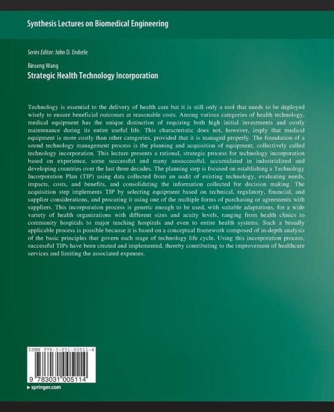 Technology is essential to the delivery of health care but it is still only a tool that needs to be deployed wisely to ensure beneficial outcomes at reasonable costs. Among various categories of health technology, medical equipment has the unique distinction of requiring both high initial investments and costly maintenance during its entire useful life. This characteristic does not, however, imply that medical equipment is more costly than other categories, provided that it is managed properly. The foundation of a sound technology management process is the planning and acquisition of equipment, collectively called technology incorporation. This lecture presents a rational, strategic process for technology incorporation based on experience, some successful and many unsuccessful, accumulated in industrialized and developing countries over the last three decades. The planning step is focused on establishing a Technology Incorporation Plan (TIP) using data collected from an audit of existing technology, evaluating needs, impacts, costs, and benefits, and consolidating the information collected for decision making. The acquisition step implements TIP by selecting equipment based on technical, regulatory, financial, and supplier considerations, and procuring it using one of the multiple forms of purchasing or agreements with suppliers. This incorporation process is generic enough to be used, with suitable adaptations, for a wide variety of health organizations with different sizes and acuity levels, ranging from health clinics to community hospitals to major teaching hospitals and even to entire health systems. Such a broadly applicable process is possible because it is based on a conceptual framework composed of in-depth analysis of the basic principles that govern each stage of technology lifecycle. Using this incorporation process, successful TIPs have been created and implemented, thereby contributing to the improvement of healthcare services and limiting the associated expenses. Table of Contents: Introduction / Conceptual Framework / The Incorporation Process / Discussion / Conclusions
