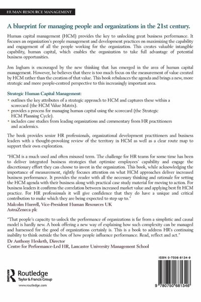 Strategic human capital management (HCM) is not just a measurement focused approach to human resource management (HRM). It is certainly not a decision science in which people can be managed as a result of quantitative analysis and financial valuation. In fact, it is probably more of an art than a science and is a way of leading people to unlock great business performance. Strategic HCM focuses all people management and development practices on maximizing the capability and engagement of the people working for an organization to create valuable intangible capability, human capital, which enables the organisation to take full advantage of potential business opportunities. Unlike HRM which focuses on getting closer and closer to the business, strategic HCM draws its energy from people, from their individual strengths, interests and motivations, which, aligned with long-term business strategy, can increasingly provide the main basis for differentiation and competitive advantage. However, the perspective also recognizes that measurement is important, and the book outlines an approach to measurement which recognizes the importance of knowledge, complexity, best fit and intangibility. Pulling together seemingly disparate strands of thinking, the book calls for a paradigm change in which people really are seen as an organisation's most important asset, and are managed in a way that reflects this fact. The text includes case studies from leading private and public sector organizations and commentary from HR practitioners and academics.