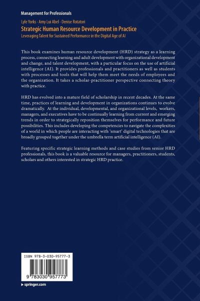Chapter 1. The Scope of Human Resource Development.- Chapter 2. Foundations of Learning Theory for HRD Practice.- Chapter 3. Strategically Positioning HRD Practice in Organizations.- Chapter 4. Digitalization, Artificial Intelligence and Strategic HRD.- Chapter 5. Data and Analytics for Improved HRD Performance in the Age of Digital Technologies.- Chapter 6. Strategic Learning for Sustainable Organization Performance.- Chapter 7. Aligning Strategic, Tactical, and Operational Level Learning and Development for Performance.- Chapter 8. Transfer of Learning: The Path that Connects Learning to Performance.- Chapter 9. The Future of Work in the Age of AI.