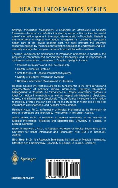 Strategic Information Management In Hospitals: An Introduction To Hospital Information Systems is a definitive volume written by four authoritative voices in medical informatics. Illustrating the importance of hospital information management in delivering high quality health care at the lowest possible cost, this book provides the essential resources needed by the medical informatics specialist to understand and successfully manage the complex nature of hospital information systems. Author of the book's Foreword, Reed M. Gardner, PhD, Professor and Chair, Department of Medical Informatics, University of Utah and LDS Hospital, Salt Lake City, Utah, applauds the text's focus on the underlying administrative systems that are in place in hospitals throughout the world. He writes, "These administrative systems are fundamental to the development and implementation of the even more challenging systems that acquire, process, and manage the patient's clinical information. Hospital information systems provide a major part of the information needed by those paying for health care." Chapter highlights include: significance of information processing in hospitals; information systems and their components; health information systems; architectures of hospital information systems; and organizational structures for information management.