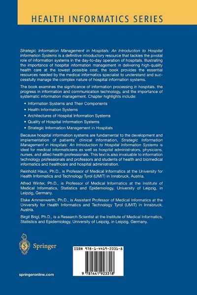 Strategic Information Management In Hospitals: An Introduction To Hospital Information Systems is a definitive volume written by four authoritative voices in medical informatics. Illustrating the importance of hospital information management in delivering high quality health care at the lowest possible cost, this book provides the essential resources needed by the medical informatics specialist to understand and successfully manage the complex nature of hospital information systems. Author of the book's Foreword, Reed M. Gardner, PhD, Professor and Chair, Department of Medical Informatics, University of Utah and LDS Hospital, Salt Lake City, Utah, applauds the text's focus on the underlying administrative systems that are in place in hospitals throughout the world. He writes, "These administrative systems are fundamental to the development and implementation of the even more challenging systems that acquire, process, and manage the patient's clinical information. Hospital information systems provide a major part of the information needed by those paying for health care." Chapter highlights include: significance of information processing in hospitals; information systems and their components; health information systems; architectures of hospital information systems; and organizational structures for information management.
