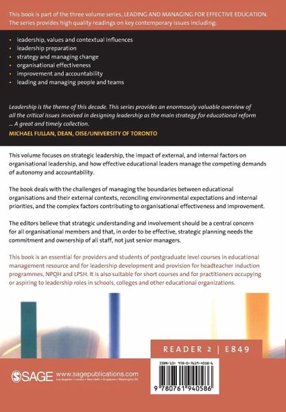 This volume focuses on strategic leadership, the impact of external and internal factors on organizational leadership, and how effective educational leaders manage the competing demands of autonomy and accountability. The book deals with the challenges of managing the boundaries between educational organizations and their external contexts, and reconciling environmental expectations and internal priorities.