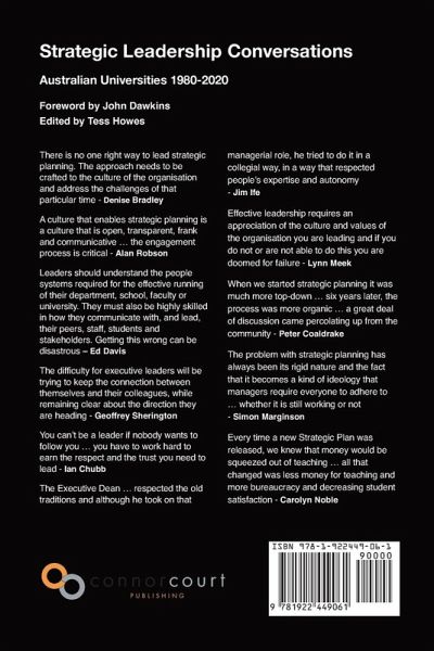 There is no one right way to lead strategic planning. The approach needs to be crafted to the culture of the organisation and address the challenges of that particular time - Denise Bradley A culture that enables strategic planning is a culture that is open, transparent, frank and communicative … the engagement process is critical - Alan Robson Leaders should understand the people systems required for the effective running of their department, school, faculty or university. They must also be highly skilled in how they communicate with, and lead, their peers, staff, students and stakeholders. Getting this wrong can be disastrous – Ed Davis The difficulty for executive leaders will be trying to keep the connection between themselves and their colleagues, while remaining clear about the direction they are heading - Geoffrey Sherington You can’t be a leader if nobody wants to follow you … you have to work hard to earn the respect and the trust you need to lead - Ian Chubb The Executive Dean … respected the old traditions and although he took on that managerial role, he tried to do it in a collegial way, in a way that respected people’s expertise and autonomy - Jim Ife Effective leadership requires an appreciation of the culture and values of the organisation you are leading and if you do not or are not able to do this you are doomed for failure - Lynn Meek When we started strategic planning it was much more top-down … six years later, the process was more organic … a great deal of discussion came percolating up from the community - Peter Coaldrake The problem with strategic planning has always been its rigid nature and the fact that it becomes a kind of ideology that managers require everyone to adhere to … whether it is still working or not - Simon Marginson Every time a new Strategic Plan was released, we knew that money would be squeezed out of teaching … all that changed was less money for teaching and more bureaucracy and decreasing student satisfaction - Carolyn Noble