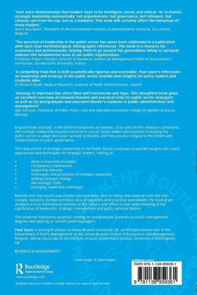 'Paul Joyce demonstrates evidence that leaders need to be intelligent, social, and ethical. He re-frames strategic leadership substantially: not organizations, but governance; not followers, but citizens; not from the top, but as a mediator. This book will certainly affect the behaviour of many leaders.' - Geert Bouckaert, President of the International Institute of Administrative Sciences, KU Leuven, Belgium