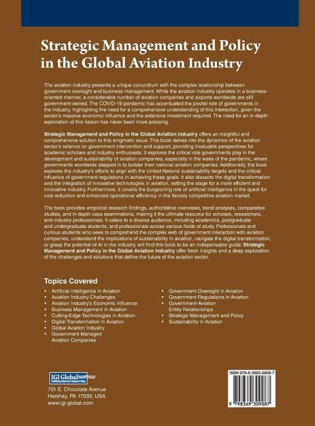 The aviation industry presents a unique conundrum with the complex relationship between government oversight and business management. While the aviation industry operates in a business-oriented manner, a considerable number of aviation companies and airports worldwide are still government-owned. The COVID-19 pandemic has accentuated the pivotal role of governments in the industry, highlighting the need for a comprehensive understanding of this interaction, given the sector's massive economic influence and the extensive investment required. The need for an in-depth exploration of this liaison has never been more pressing. Strategic Management and Policy in the Global Aviation Industry offers an insightful and comprehensive solution to this enigmatic issue. This book delves into the dynamics of the aviation sector's reliance on government intervention and support, providing invaluable perspectives for academic scholars and industry enthusiasts. It explores the critical role governments play in the development and sustainability of aviation companies, especially in the wake of the pandemic, where governments worldwide stepped in to bolster their national aviation companies. Additionally, the book explores the industry's efforts to align with the United Nations' sustainability targets and the critical influence of government regulations in achieving these goals. It also dissects the digital transformation and the integration of innovative technologies in aviation, setting the stage for a more efficient and innovative industry. Furthermore, it unveils the burgeoning role of artificial intelligence in the quest for cost reduction and enhanced operational efficiency in the fiercely competitive aviation market.