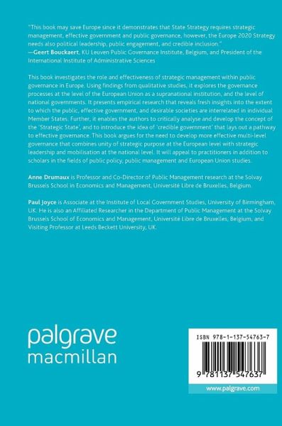 This book investigates the role and effectiveness of strategic management within public governance in Europe. Using findings from qualitative studies, it explores the governance processes at the level of the European Union as a supranational institution, and the level of national governments. It presents empirical research that reveals fresh insights into the extent to which the public, effective government, and desirable societies are interrelated in individual Member States. Further, it enables the authors to critically analyse and develop the concept of the 'Strategic State', and to introduce the idea of 'credible government' that lays out a pathway to effective governance. This book argues for the need to develop more effective multi-level governance that combines unity of strategic purpose at the European level with strategic leadership and mobilisation at the national level. It will appeal to practitioners in addition to scholars in the fields of public policy, public management and European Union studies.