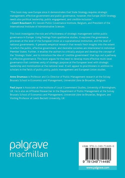 This book investigates the role and effectiveness of strategic management within public governance in Europe. Using findings from qualitative studies, it explores the governance processes at the level of the European Union as a supranational institution, and the level of national governments. It presents empirical research that reveals fresh insights into the extent to which the public, effective government, and desirable societies are interrelated in individual Member States. Further, it enables the authors to critically analyse and develop the concept of the 'Strategic State', and to introduce the idea of 'credible government' that lays out a pathway to effective governance. This book argues for the need to develop more effective multi-level governance that combines unity of strategic purpose at the European level with strategic leadership and mobilisation at the national level. It will appeal to practitioners in addition to scholars in the fields of public policy, public management and European Union studies.