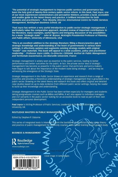 Strategic Management for the Public Sector has been written specially for managers and students taking postgraduate courses such as MBAs and MPAs. It will also appeal to individual managers and civil servants in the public sector looking for an accessible book to read as part their own independent personal development.
