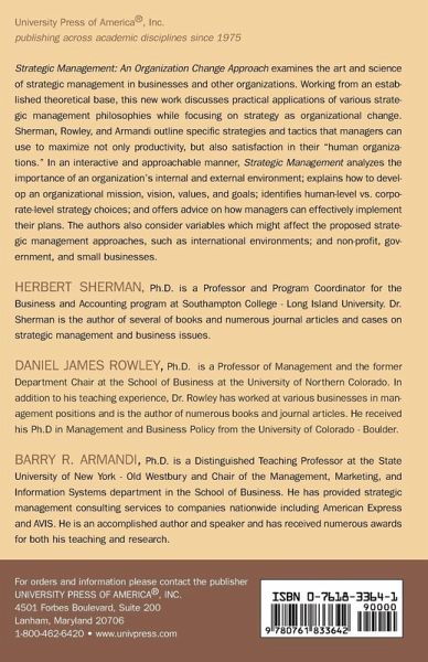 Strategic Management: An Organization Change Approach examines the art and science of strategic management in businesses and other organizations. Working from an established theoretical base, this new work discusses practical applications of various strategic management philosophies while focusing on strategy as organizational change.