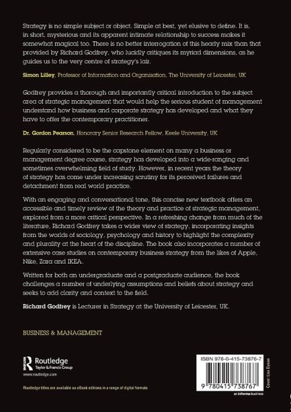 Regularly considered to be the cap-stone course on any business or management degree, strategy has developed into a wide-ranging and sometimes overwhelming field of study. However, in recent years the theory of strategy has come under increasing scrutiny for its perceived failures and detachment from real world practice. With an engaging and conversational tone, this new concise textbook offers an accessible and timely review of the theory and practice of strategic management, explored from a more critical perspective. In a refreshing change from much of the literature, Richard Godfrey takes a wider view of strategy, incorporating insights from the worlds of sociology, psychology and history to highlight the complexity and plurality at the heart of the discipline. The book also incorporates a number of extensive case studies on contemporary business strategy from the likes of Apple, Nike, Zara and IKEA. Written for both an undergraduate and postgraduate audience, the book challenges a number of underlying assumption and beliefs about strategy and seeks to add clarity and context to the field.