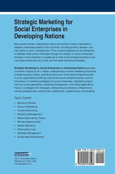 Many governments in developing nations are finding it nearly impossible to address challenges posed to their countries, including poverty, disease, and high levels of youth unemployment. Thus, social entrepreneurs are attempting to address these social challenges through the creation of social enterprises. However, further research is needed as to what social entrepreneurship is and how these enterprises can utilize and formulate marketing strategies. Strategic Marketing for Social Enterprises in Developing Nations provides innovative insights for an in-depth understanding of where marketing and social entrepreneurship interact, providing clarity as to what social entrepreneurship is as an organizational offering, what drives social entrepreneurship, and the formulation of marketing strategies for social enterprises. Highlighting topics such as income generating, marketing management, and media dependency theory, it is designed for managers, entrepreneurial advisors, entrepreneurs, industry professionals, practitioners, researchers, academicians, and students.