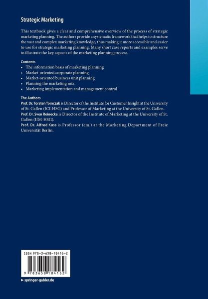 This textbook gives a clear and comprehensive overview of the process of strategic marketing planning. The authors provide a systematic framework that helps to structure the vast and complex marketing knowledge, thus making it more accessible and easier to use for strategic marketing planning. Many short case reports and examples serve to illustrate the key aspects of the marketing planning process.