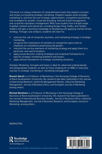 This book is a unique collection of comprehensive cases that explore concepts and issues surrounding strategic marketing. Chapters explain what strategic marketing is, and then discuss strategic segmentation, competitive positioning, and strategies for growth, corporate branding, internal brand management, and corporate reputation management. With case studies from a broad range of global contexts and industries, including Burger King, FedEx, and Twitter, readers will gain a working knowledge of developing and applying market-driven strategy. Through case analysis, students will learn to: examine the role of corporate, business, and marketing strategy in strategic marketing; recognize the implications of markets on competitive space with an emphasis on competitive positioning and growth; interpret the various elements of marketing strategy and apply them to a particular real-world situation; apply sound decision-making strategies and analytical frameworks to specific strategic marketing problems and issues; apply ethical frameworks to strategic marketing situations. Strategic Marketing: Concepts and Cases is ideal for advanced undergraduate and postgraduate students, as well as those studying for an MBA or executive courses in strategic marketing or marketing management.