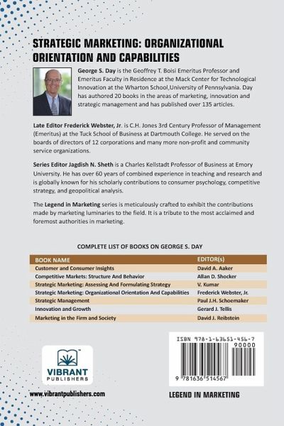 Strategic Marketing: Organizational Orientation and Capabilities by George S. Day examines how internal organizational factors influence the success of marketing strategies. This book brings together pivotal research that highlights the importance of market orientation, internal capabilities, and cross-functional alignment in driving sustained competitive advantage. Day emphasizes how an organization's culture, systems, and processes impact its ability to anticipate market needs, respond effectively to change, and build long-term value. Topics include marketing capability development, organizational learning, responsiveness, and the role of leadership in shaping marketing performance. Blending theory with practical insight, the book provides valuable tools for identifying and nurturing the strategic capabilities that make marketing more adaptive and impactful. Whether you're a business scholar, CMO, or marketing strategist, this book will deepen your understanding of what it takes to embed marketing excellence into the core of an organization. As part of the Legend in Marketing series, this collection captures the enduring impact of George Day's scholarship on marketing capability-building.