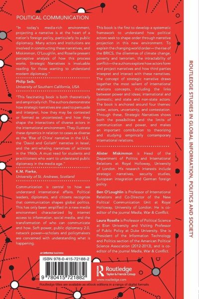 'In today's media-rich environment, projecting a narrative is at the heart of a nation's foreign policy, particularly its public diplomacy. Many actors and institutions are involved in constructing these narratives, and Miskimmon, O'Loughlin, and Roselle present perceptive analysis of how this process works. Strategic Narratives is invaluable reading for those wanting to understand modern diplomacy.' -Philip Seib, University of Southern California