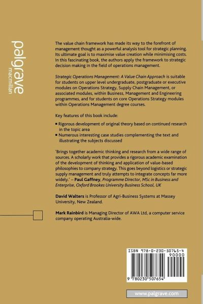 The value chain framework has made its way to the forefront of management thought as a powerful analysis tool for strategic planning. Its ultimate goal is to maximize value creation while minimizing costs. In this book David Walters applies the framework to strategic decision making in the field of operations management. Companion Website: http: //www.palgrave.com/business/walters