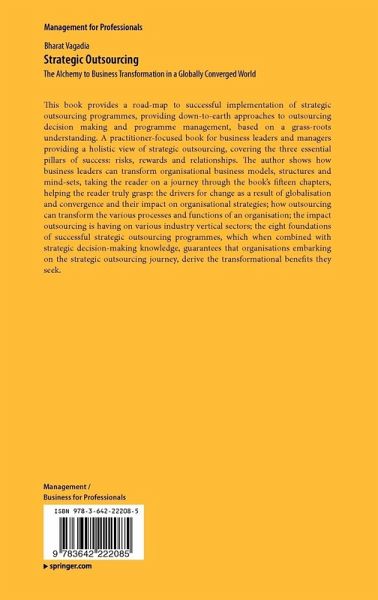 This book provides a road-map to successful implementation of strategic outsourcing programmes, providing down-to-earth approaches to outsourcing decision making and programme management, based on a grass-roots understanding. A practitioner-focused book for business leaders and managers providing a holistic view of strategic outsourcing, covering the three essential pillars of success: risks, rewards and relationships. The author shows how business leaders can transform organisational business models, structures and mind-sets, taking the reader on a journey through the book's fifteen chapters, helping the reader truly grasp: the drivers for change as a result of globalisation and convergence and their impact on organisational strategies; how outsourcing can transform the various processes and functions of an organisation; the impact outsourcing is having on various industry vertical sectors; the eight foundations of successful strategic outsourcing programmes, which when combinedwith strategic decision-making knowledge, guarantees that organisations embarking on the strategic outsourcing journey, derive the transformational benefits they seek.
