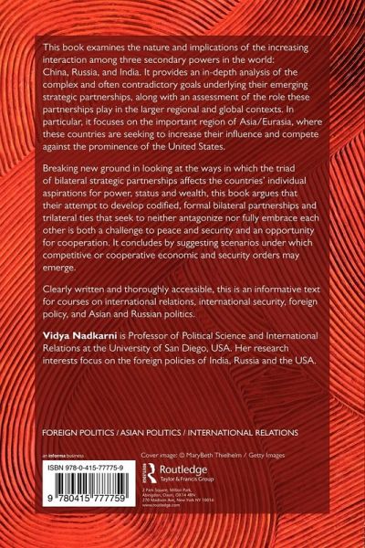This book examines the nature and implications of the increasing interaction among three secondary powers in the world: China, Russia and India. It provides an in-depth analysis of the complex and often contradictory goals underlying their emerging strategic partnerships along with an assessment of the role these partnerships play in the larger regional and global contexts. In particular, it focuses on the important region of Asia/Eurasia, where these countries seek to increase their influence and compete against the prominence of the United States. Breaking new ground in looking at the ways in which the triad of bilateral strategic partnerships affect the countries' individual aspirations for power, status and wealth, this book argues that their attempt to develop codified, formal bilateral partnerships and trilateral ties that seek to neither antagonise nor fully embrace each other is both a challenge to peace and security and an opportunity for cooperation. It concludes by suggesting scenarios under which competitive or cooperative economic and security orders may emerge. Clearly written and thoroughly accessible, this book will be an informative text for courses on international relations, international security, foreign policy and Asian and Russian politics.