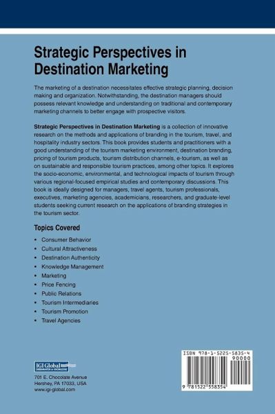 The marketing of a destination necessitates effective strategic planning, decision making and organization. Notwithstanding, the destination managers should possess relevant knowledge and understanding on traditional and contemporary marketing channels to better engage with prospective visitors. Strategic Perspectives in Destination Marketing is a collection of innovative research on the methods and applications of branding in the tourism, travel, and hospitality industry sectors. This book provides students and practitioners with a good understanding of the tourism marketing environment, destination branding, pricing of tourism products, tourism distribution channels, e-tourism, as well as on sustainable and responsible tourism practices, among other topics. It explores the socio-economic, environmental, and technological impacts of tourism through various regional-focused empirical studies and contemporary discussions. This book is ideally designed for managers, travel agents, tourism professionals, executives, marketing agencies, academicians, researchers, and graduate-level students seeking current research on the applications of branding strategies in the tourism sector.