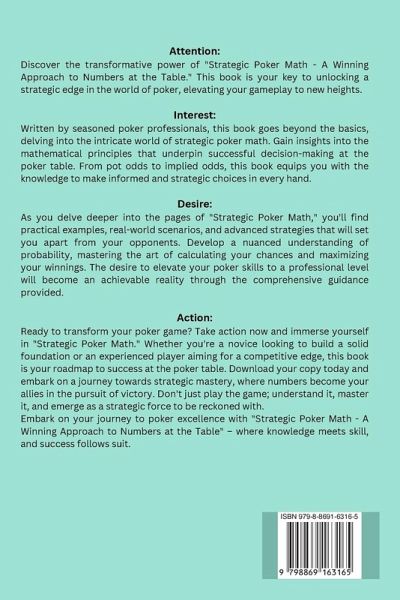 Welcome to "Strategic Poker Math: A Winning Approach to Numbers at the Table." This e-book is designed to be your all-in-one resource, giving you the knowledge and abilities needed to improve your poker skills by developing a strategic grasp of numbers. You don't need to be a mathematician to understand the concepts in this book. A basic understanding of mathematics is enough to get started. Knowing the function of mathematics in the dynamic game of poker, where talent, strategy, and psychology all come together, is revolutionary. Poker is a game of skill and strategy rather than just chance. Every play in poker, from the pre-flop choices to the river, is a complex dance between math and intuition. With the help of this book, you will be able to understand the intricacies of poker math and approach the table with confidence and a winning mindset. In the first few chapters, we'll lay out the foundational ideas of poker math, covering concepts like probability, hand odds, and pot odds. You'll discover how to compute expected value (EV), assess ranges, and apply these mathematical fundamentals to your decisionmaking as we go along.